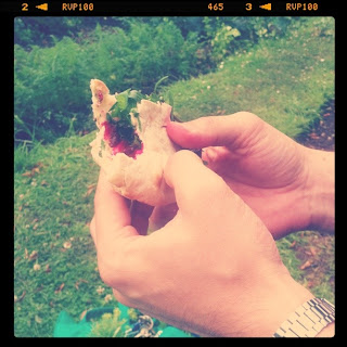 A warmed pitta, stuffed with some cold, roasted beetroot, a few slices of cheese, fresh tomatoes and a handful of just-picked rocket; enjoyed at the allotment, on a break from weeding.